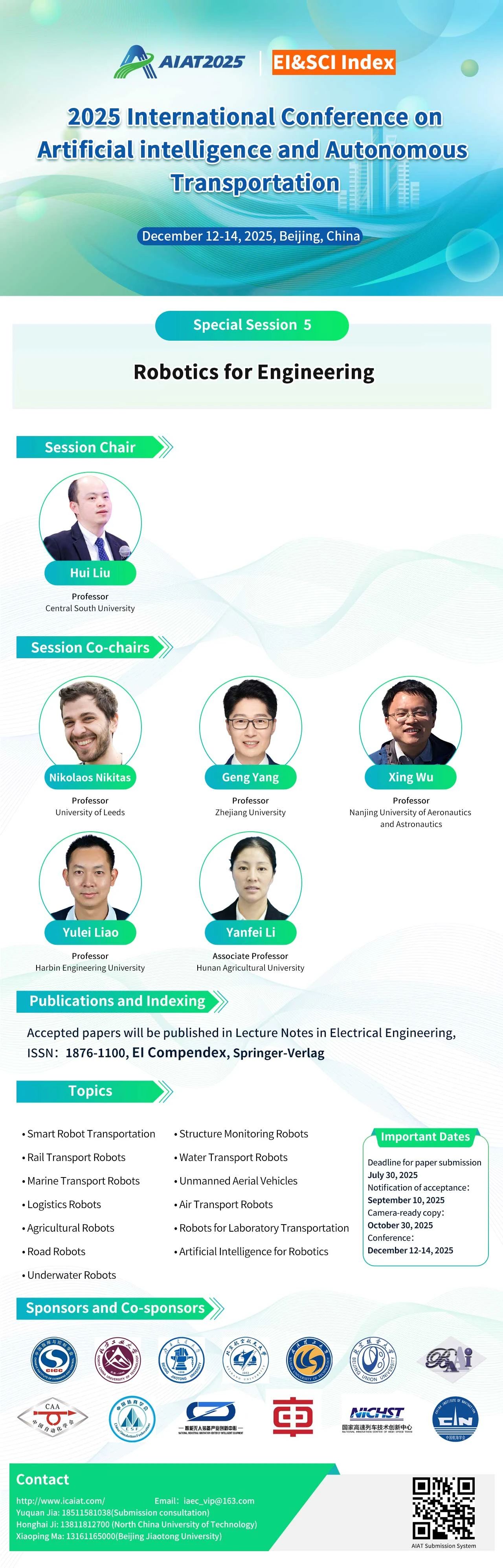 会议录用的全部英文论文由Springer-Verlag旗下的Lecture Notes in Electrical Engineering (LNEE,ISSN:1876-1100,EI-Compendex,LNEE已进入EI目录多年,EI检索稳定, AIAT往届会议论文集在出版后约1个月全被EI检索)出版。另外,优秀论文将有机会被推荐至下面SCI期刊发表。