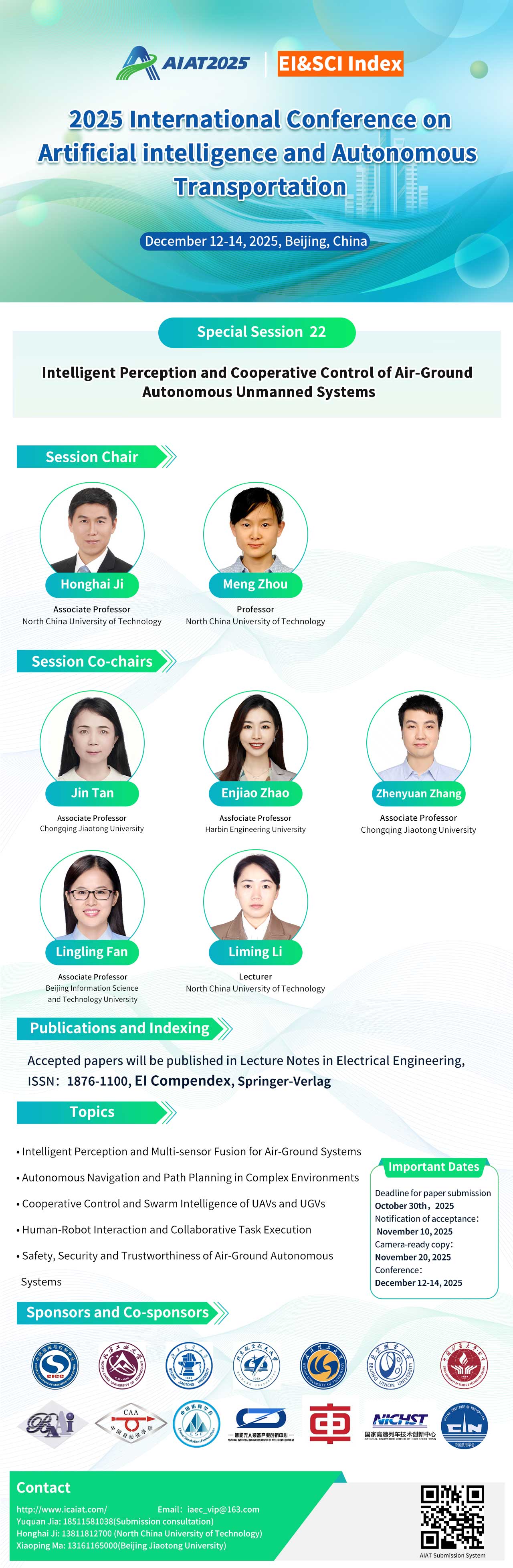 2025年人工智能与自主式交通国际学术会议(AIAT 2025)将于2025年12月12-14日在北京举行。本会议由中国指挥与控制学会、北方工业大学主办,由北方工业大学、北京交通大学、中国指挥与控制学会自主式交通控制与安全专业委会、中国智能交通协会轨道智能运输系统专业委员会等单位共同承办。本会议旨在为交通、人工智能、自动化领域的研究人员、工程师和行业专家提供一个交流平台,促进人工智能和自主式交通交叉领域的科研学术交流和产业创新发展。
