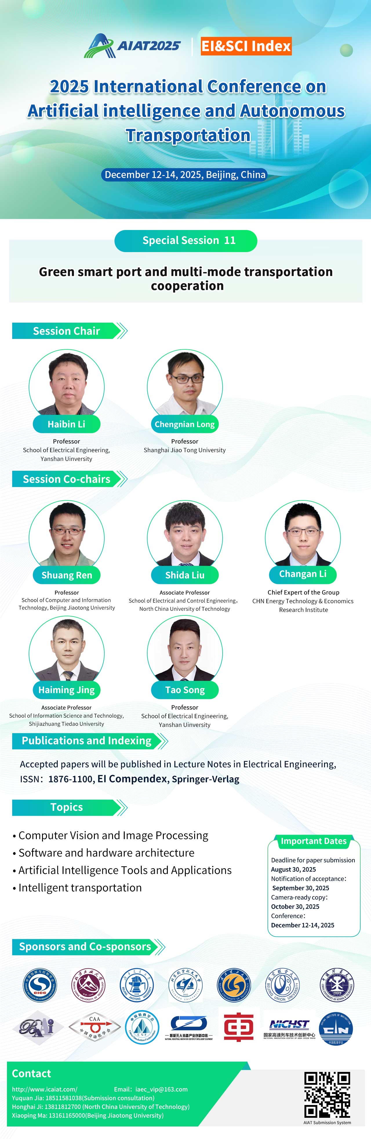 2025年人工智能与自主式交通国际学术会议(AIAT 2025)将于2025年12月12-14日在北京举行。本会议由中国指挥与控制学会、北方工业大学主办,由北方工业大学、北京交通大学、中国指挥与控制学会自主式交通控制与安全专业委会、中国智能交通协会轨道智能运输系统专业委员会等单位共同承办。本会议旨在为交通、人工智能、自动化领域的研究人员、工程师和行业专家提供一个交流平台,促进人工智能和自主式交通交叉领域的科研学术交流和产业创新发展。